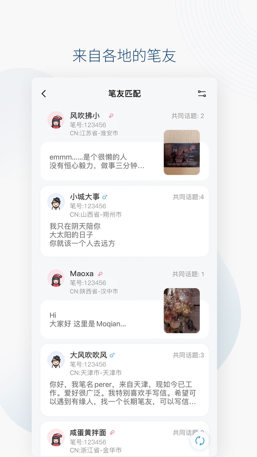 4:互寄明信片,通过Slowchat与笔友随机交流明信片,也可组队参与互换明信片