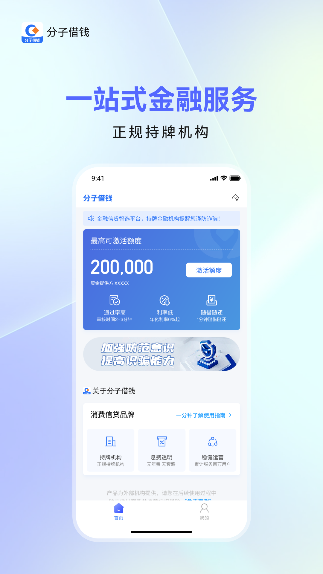免责申明: 360手机助手仅为信息发布平台,不对第三方发布的金融产品信息真实性及准确性负责,也不提供投资、理财、贷款等服务。360手机助手和金融产品之间不存在任何关系,不构成任何担保或承诺。提醒您使用此类应用时提高风险意识,勿将身份证号码、银行卡密码、验证码等敏感信息透露给第三方,如您通360手机助手进入第三方网站或应用进行投资、理财、贷款等行为,由此产生的损失,360手机助手不承担任何责任。【产品介绍】分子借钱是一款为个人消费者、小微企业、个体工商户提供互联网借贷服务的一站式信贷服务平台,专业大数据智能推荐,0-20万信用借款额度选择;利率低,下款快,轻松解决资金周转难题!【产品特点】1、超高额度:审批后额度高至20万元;2、超低利率:综合年化利率7.2%~24%;3、闪电放款:线上操作、急速放款;4、金牌服务:正规持牌机构,值得信赖;【温馨提示】贷款额度、放款时间、通过率以实际审批结果为准。贷款有风险,借款需谨慎,请依据个人能力合理贷款,理性消费,避免逾期