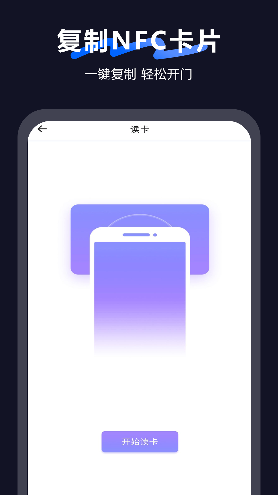 这是一款门禁读卡器软件,通过判断手机是否支持NFC功能,支持读取、写入门禁卡,公交卡、电梯卡等;将卡片保存到卡包,卡片信息,一目了然。一个APP把你的门禁卡放进手机,方便好用简单轻松,再也不用担心忘记带门禁钥匙。