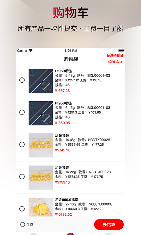 平台常备万款金饰现货,同时不断跟进市场需求,精选潮流热卖款式即时上架,所有上架金饰重量准到0.01克,让您买的放心。