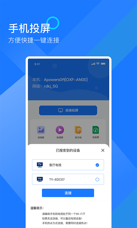 手机上的视频、图片和音乐投屏到电视看,享受大屏体验;