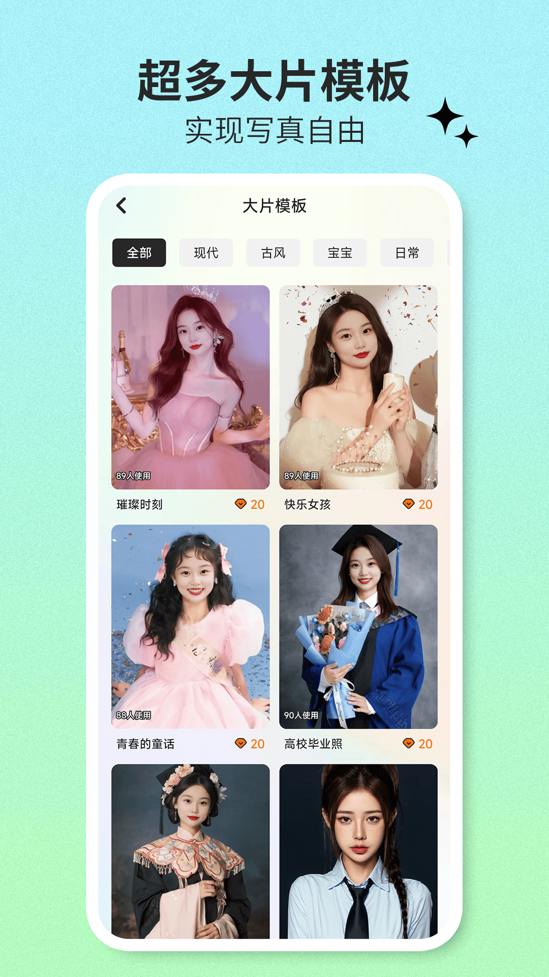 1.多样写真模板,芭比、古风、职场、证件照等风格千万选择,轻松体验不同妆造魅力。