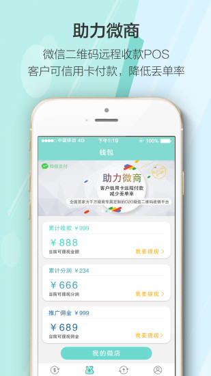 为中国千万微商专属定制的远程收款POS,客户可信用卡付款,提高成交率,微信支付,资金安全有保障;