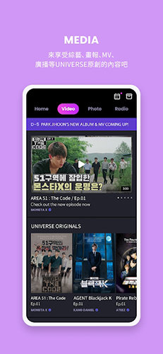 universe中文版,universe app是一个专门为追星爱好者打造的韩国追星软件,支持中文版本,大家可以在这里了解最新的韩流资讯,还可以时刻关注到自己喜欢的韩国明星的最新情况,明星也会在这里发布各种生活动态,有机会可以和自己喜欢的明星进行交流互动,universe主要是为粉丝提供一个互动渠道,通过网络的方式完成互动,让粉丝可以在上面了解自己的idol,并且可以直接在了解了相关内容,而且大家还可以在这里认识更多志同道合的追星好友,感兴趣就来下载universe体验吧!