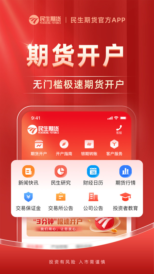 民生期货开户交易APP是民生期货官方一款集开户、交易、行情、资讯等为一体的专业期货软件。能为广大投资者提供期货开户、期货行情、期货交易、期货资讯以及预约开户等功能于一体的一站式期货投资服务平台;