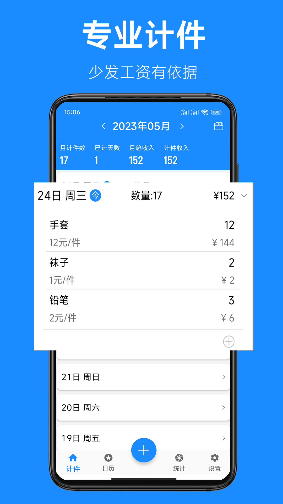 1、计件-首页日期列表即可根据工作种类记录每天完成的件数,也可以看到历史每日的数据情况。方便快捷,一件记录。