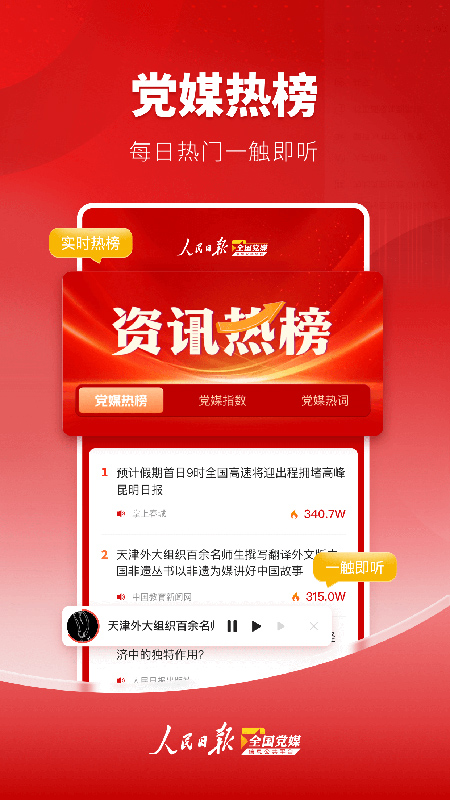 【党媒热榜】全新升级的特色栏目专区——整合“党媒热榜”“党媒指数”“党媒热词”特色栏目,上线“听新闻”音频服务。