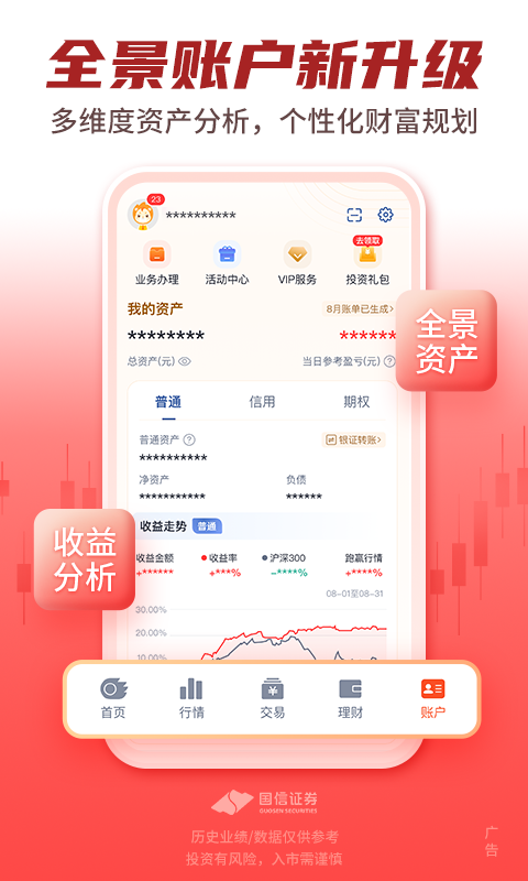 5、投顾服务:集合国信精英投顾团队和金融科技,提供旗舰级资讯及投研、一站式投资方案、服务讲解和精英型投顾组合,满足客户日常投资的各类需求;