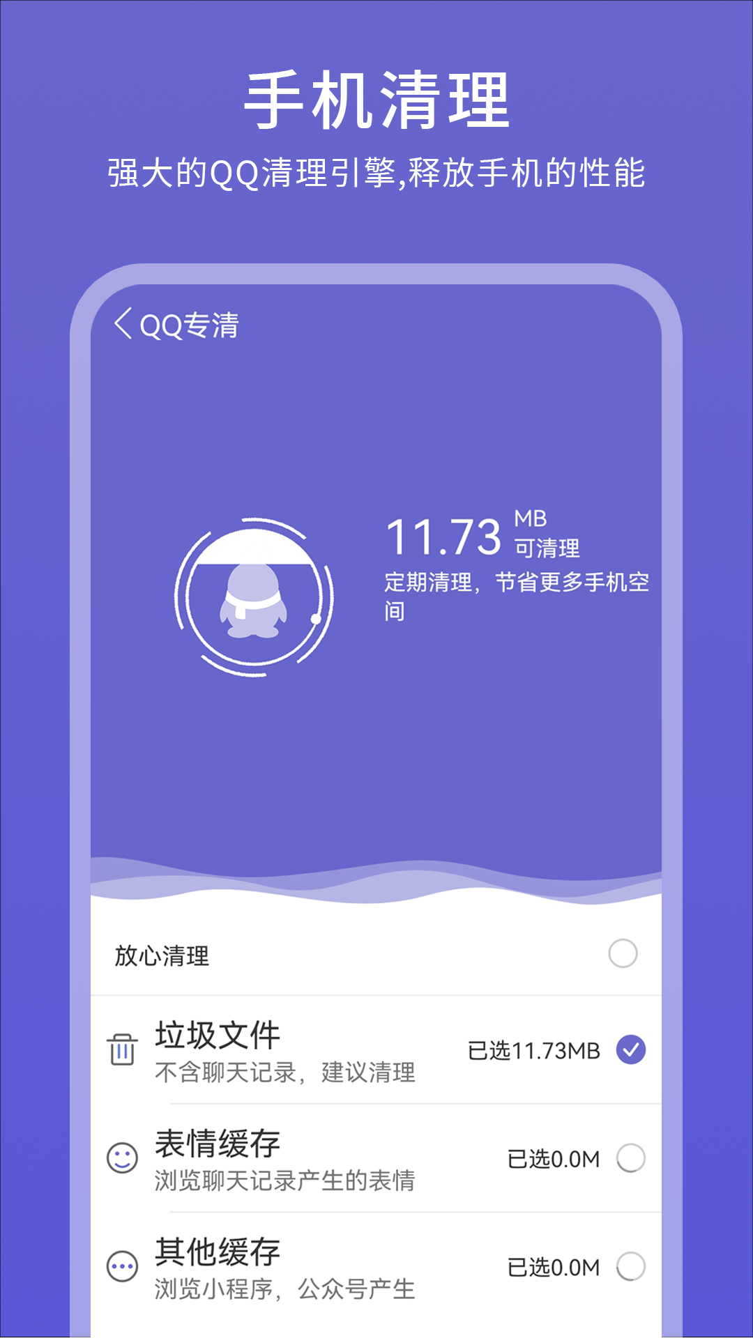 功能特色:1内存加速,一键为手机加速,释放手机存储空间,游戏更顺畅2专项清理,有效清理手机在使用过程中产生的一切手机垃圾,解决内存不足等问题3清理垃圾,微信、QQ专项清理,聊天垃圾过多,释放更多空间4极速安全,解决手机卡顿的问题,快速清理垃圾文件,一键手机加速5安全管家,垃圾文件清理引擎,快速进行垃圾清理,提升手机运行速度