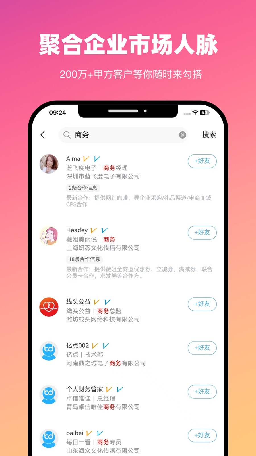 BDwork作为国内领头的异业合作平台,从异业合作信息为切入点,通过汇集的海量合作需求,聚合各企业人脉和资源力量,对信息进行智能分析、自动匹配、商机挖掘,从而促进同行上下产业链对接、跨界合作、异业合作、跨境合作等各类合作达成。