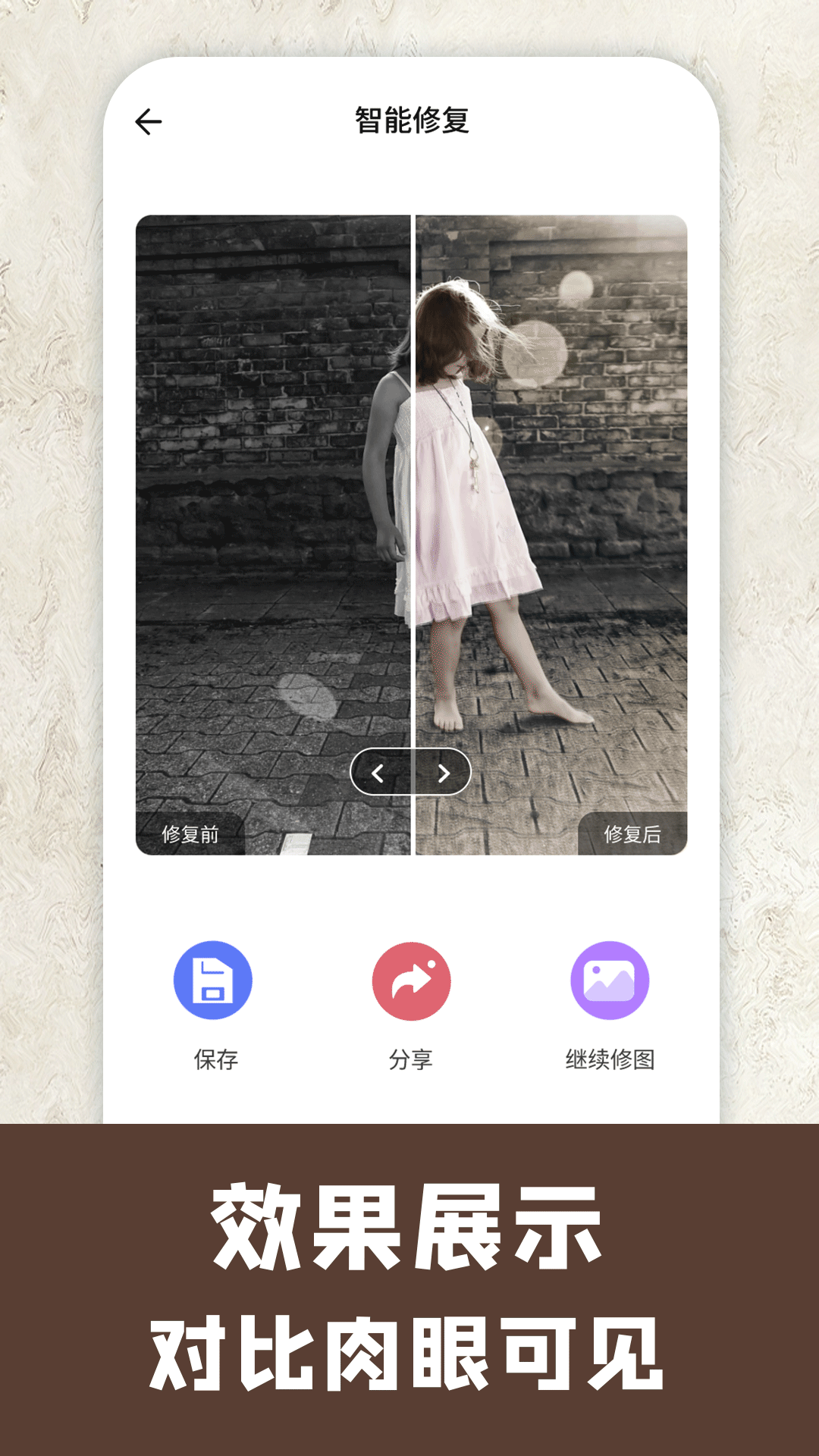 人脸特征修复,针对照片中的人物五官定位复原,重现五官特征。老旧照片画质修复使珍贵的年代久远的照片重放光彩,并自动上色,补色,效果自然逼真。