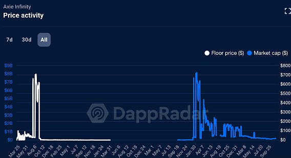 在2021年最巅峰期时,Axie的最高日收入曾达到惊人的1750万美元,日活用户(DAU)超150万,项目30天总收入达到3亿美元,超越了大多数传统游戏的盈利能力。但Axie在巅峰并没有站太久,半年多时间就开始出现增长乏力,此后的任何营销活动就没能让它重回巅峰。Crypto Slam数据显示,到2023年11月末,Axie 月销售额仅为2.8万美元。DappRader数据显示,Axie Infinity NFT的地板价与市值也一同跌入了谷底。
