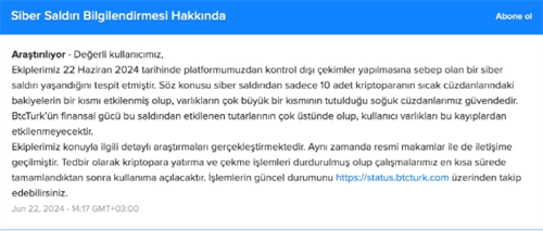 BtcTurk在6月22日的声明中表示:“此次网络攻击仅影响了我们热钱包中的部分加密货币余额,而冷钱包中的大部分资产依然安全可靠。”该交易所拥有超过500万用户,此次事件对其声誉和客户信任度造成了一定影响。