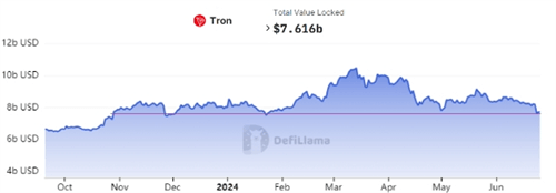 TRX的上涨与Tron创始人贾斯汀·孙(Justin Sun)的一个大笔转账行为不谋而合。据Arkham Intelligence的数据显示,6月27日,孙向Binance转账了价值2140万美元的1.738亿TRX。然而,就在前一天,据DefiLlama统计,Tron的总价值锁定(TVL)跌至六个月来的低点75亿美元,这表明尽管TRX价格飙升,但主要投资者可能正在从生态系统中撤资。
