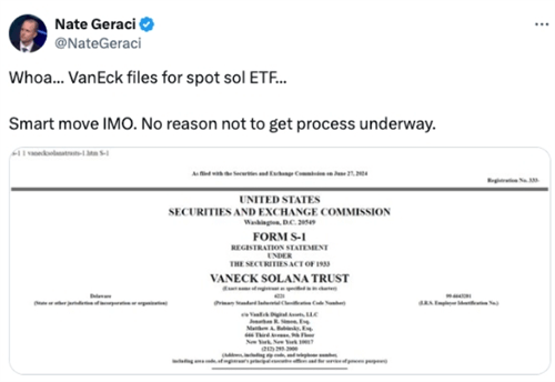 6月28日消息,VanEck,美国首批发行现货比特币交易所交易基金(ETF)的机构之一,近日已向美国证券交易委员会(SEC)提交了关于新的Solana ETF的申请,据VanEck数字资产研究主管Matthew Sigel在6月27日的声明中透露,该公司已正式向SEC提交了一份关于Solana(SOL)ETF的申请。新基金名为VanEck Solana Trust,旨在利用Solana的去中心化特性、高实用性和经济可行性来实现资本增值。Sigel表示,该信托是美国首个提交的Solana ETF申请。