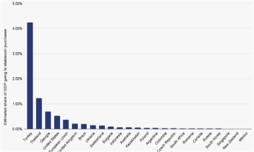 值得注意的是,土耳其近年来在加密货币领域取得了显著进展。根据币安等权威机构的数据,土耳其已成为全球加密货币生态系统中的重要参与者,交易量排名全球前列,采用率也位居高位。Chainalysis的数据显示,土耳其的稳定币购买量占GDP的比例高达4.3%,位居全球经济体之首。