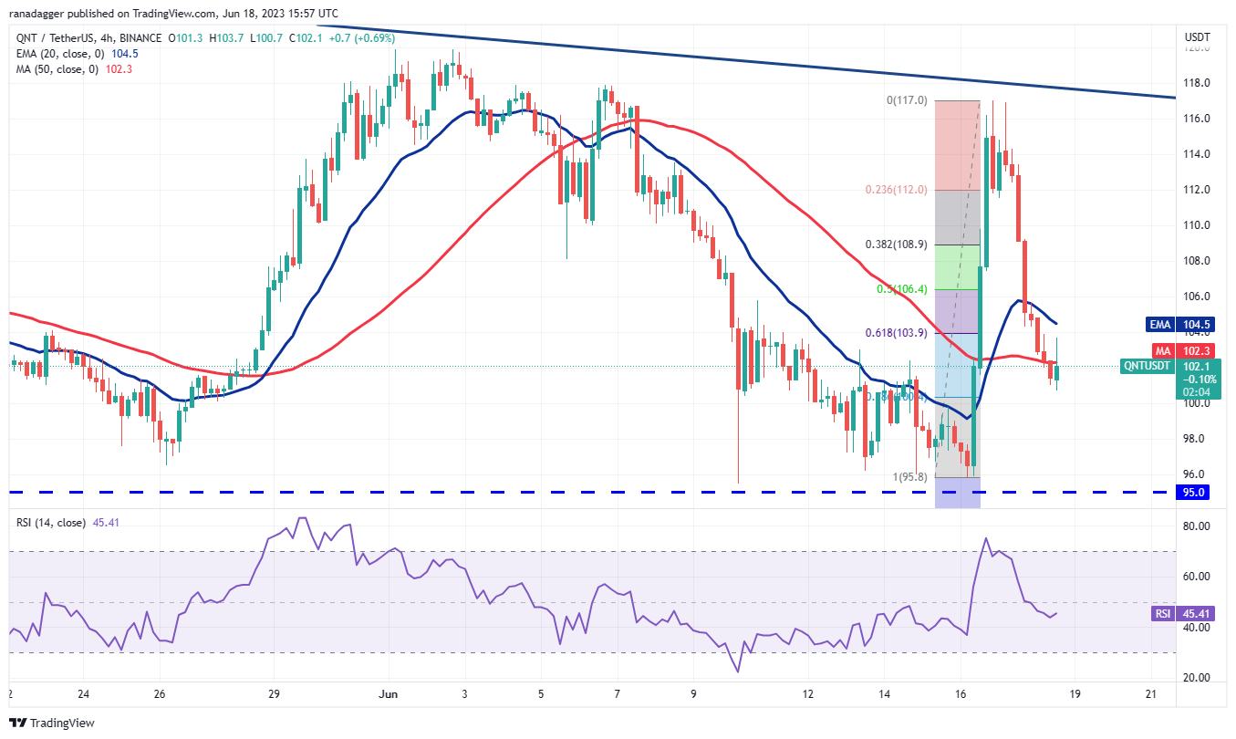 但是,空头还没有放弃,他们正在激烈地捍卫下降趋势线。卖家将试图将价格降至 95 美元以下,而多头将试图将 QNT/USDT 货币对维持在其上方。