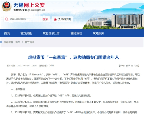 早在2023年的7月,无锡市公安官方就在官网上发布了一则警方资讯,该资讯的标题为《虚拟货币“一夜暴富”,这类骗局专门围猎老年人》,在文章中为网友门揭秘了pi币骗局与pi币的相关特点,并分享了相关案例下面我们来了解一下《虚拟货币“一夜暴富”,这类骗局专门围猎老年人》的详细内容: