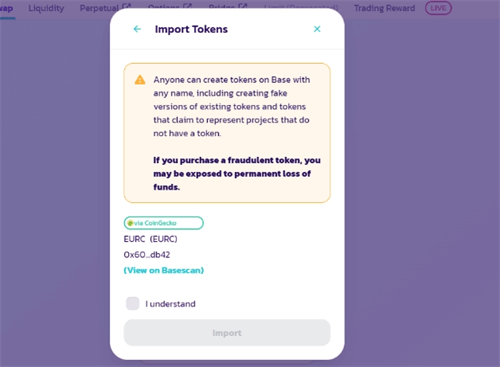 目前,在Aerodrome、Uniswap和BaseSwap等平台上搜索“EURC”尚未显示相关结果,但用户可以通过PancakeSwap的“导入”功能进行交易,不过该过程会伴随强硬的风险提示。为确保交易安全,Circle在公告中提供了EURC在Base主网上的正确令牌地址(0x60a3e35cc302bfa44cb288bc5a4f316fdb1adb42),供用户参考和验证。