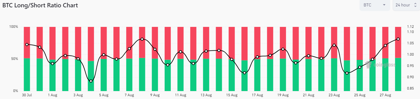 尽管卖空者连续亏损,但 48% 的期货市场仍然做空比特币价格。由于空头比率如此之高,可能会出现轧空的潜在机会,从而导致比特币价格进一步上涨。
