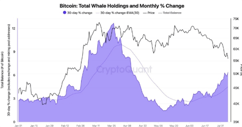此外,链上数据分析平台CryptoQuant发布的周报也揭示了积极迹象:在最近的价格下跌期间,比特币的大型投资者或“鲸鱼”继续增持,其持有量月环比增长6.3%,为自4月12日以来的最快增速。报告指出,鲸鱼的增持行为是比特币需求增长的明确信号。