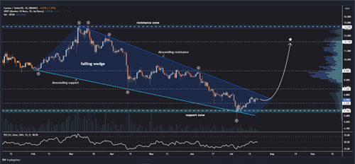 著名比特币大师乔纳森·卡特(Jonathan Carter)强调了Cosmos引人入胜的技术配置。在其日线图上,他指出ATOM正在谈判一个下降的楔形形态,有时被解释为积极的。
