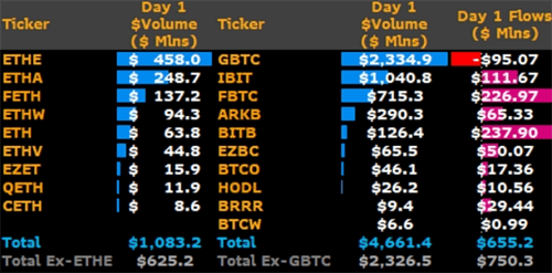 回顾今年1月,现货比特币ETF在交易首日便吸引了6.552亿美元的资金流入,其中包括Grayscale转换的比特币产品流出的9500万美元。此次以太坊ETF的上市也经历了类似的监管流程,美国证券监管机构在上市前一天批准了这些产品在纳斯达克、纽约证券交易所Arca和芝加哥期权交易所上市所需的最终S-1表格。