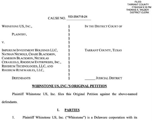 Whinstone US在德克萨斯州塔兰特县第153区法院对三家公司及其高管提起诉讼,指控他们存在欺诈、阴谋和违反证券规定的行为,严重稀释了其在合资企业中的收入份额。这家合资企业名为Rhodium,由Whinstone US与特拉华州注册的Imperium共同组建于2020年。根据协议,Whinstone US以优惠价格向合资企业提供电力,而Imperium则负责提供C楼的基础设施。