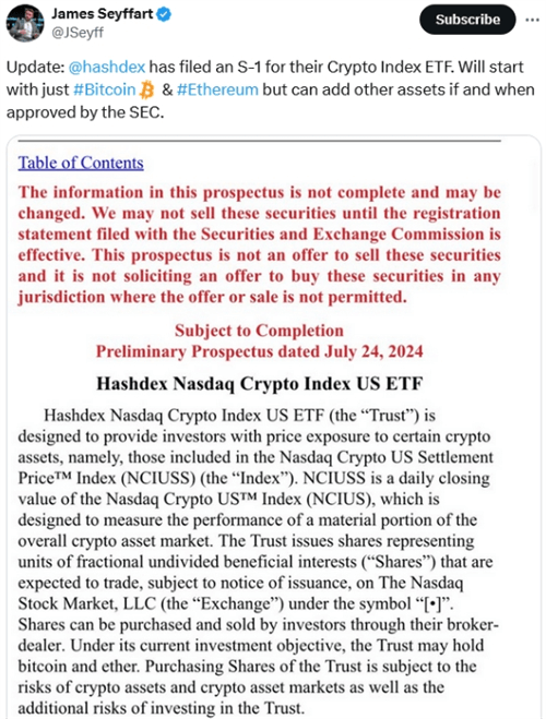 7月24日消息报道,数字资产管理公司Hashdex近日在进军美国市场的道路上取得了重要进展,正式提交了其Hashdex纳斯达克加密指数美国ETF的S-1注册声明。该ETF旨在追踪纳斯达克加密美国结算价格指数,该指数广泛代表了数字资产市场的表现。