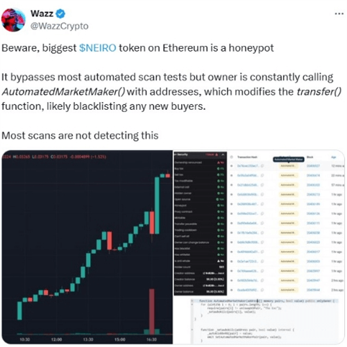 据悉,Wazz此前曾因成功揭露亿万富翁Mark Cuban热钱包遭黑客攻击而声名鹊起,此次他又将目光投向了Neiro这一特殊的模因代币。该代币的以太坊区块链地址为“0x3ad4f189f08cdc60496eeBb3bd70B90dF28B7455”,Wazz指出,该地址通过一种巧妙的方式绕过了大多数自动扫描检测,但代币的所有者却能够利用AutomatedMarketMaker()功能修改transfer()函数,潜在地将新买家列入黑名单,而大多数安全扫描工具并未能识别这一风险。