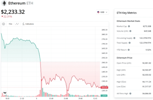 以太坊价格在截至UTC下午1:10的24小时内下跌了22.3%,交易价格徘徊在2233美元附近。尽管一度短暂跌至2195美元的日低点,但随后有所回升。然而,能否持续保持在2200美元以上仍是未知数。
