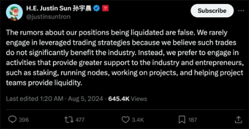 这一轮关于HTX杠杆交易的猜测始于7月12日,当时CryptoQuant创始人Ki Young-Ju指出HTX平台上存在一笔价值5.15亿美元的长期比特币期货交易,并引发了对HTX是否涉及大额杠杆交易的广泛讨论。Sun随后对此进行了否认,他表示这笔交易并非由HTX直接进行,而是由交易所的客户使用Tether稳定币(stUSDT)等作为抵押品进行的操作。Sun还强调,根据HTX的客户政策,交易所不对客户交易进行评论或提供具体信息。