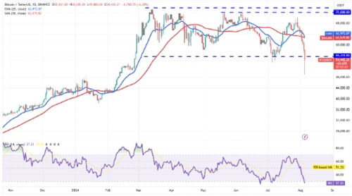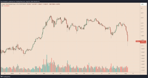 截至8月5日,加密货币市场的总市值已进入破位下行阶段,并预示着将进一步跌至1.596万亿美元附近。这一下行目标位曾在2023年12月至2024年2月期间提供过支撑。