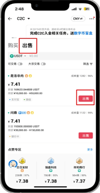 2.在APP首页,点击【CNY买币】选项,随后在顶部导航栏中切换到【出售】页面。浏览并选择合适的出售广告,点击【出售】按钮,以进入下单流程。