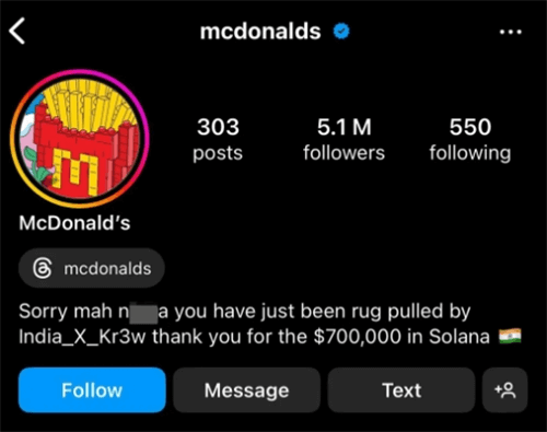 通过精心策划的抛售行动,黑客成功地在Solana网络上套现,总计获得了约70万美元的利润。为了炫耀自己的“成就”,黑客甚至在得手后修改了麦当劳Instagram账号的个人简介,写道:“很抱歉,你刚刚被India_X_Kr3w骗了,谢谢你在索拉纳的70万美元。”此举无疑是对麦当劳及其数百万粉丝的一次挑衅。