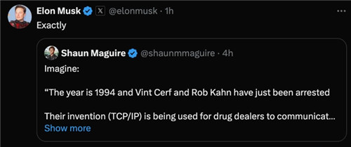 另外,马斯克也转发了一则贴文并表示认同,这则贴文试想1994年Vint Cerf和Bob Kahn(TCP/IP协议的共同发明者)被逮捕的假想情况,TCP/IP是网络的核心协议,当年Cerf和Kahn创造了这个协议,但假设他们如Pavel Durov相同,他们同样因为不愿意在系统中安装政府后门,而被指控他们的发明被用来进行非法活动,这将会阻碍全球的网络发展,并极具争议性。