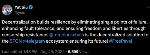 Yat Siu的贴文中还指出,去中心化具有多重优势,包括消除单点故障、增强容错能力,并且通过抵制审查来保障自由。他强调,TON区块链正是这样的去中心化解决方案。