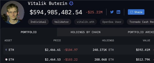 Lohuobionchain指出,Vitalik Buterin曾于3年前表示,自己当时持有32.5万枚ETH,以当时4500美元均价计算,其ETH持仓价值达14.6亿美元,但目前其地址仅持仓24万枚ETH(约5.92亿美元),3年减少8.5万枚ETH(约2.09亿美元),以美元计价,持仓价值缩水59.452%。