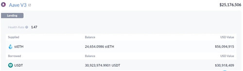 目前该地址仍持有24,651枚stETH作为保证金,价值5609万美元,借出3091万枚USDT,健康度1.48,当ETH跌至1823美元时将触发清算。