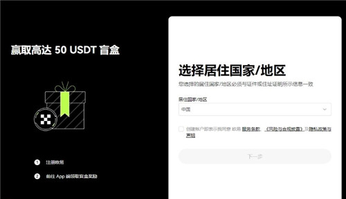 5 .选择居住国家/地区,勾选服务条款、《风险与合规披露》及隐私政策与声明
