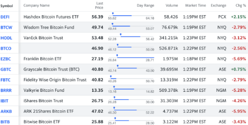 输家是在较小的参与者中发现的,这也许是意料之中的。在价格走势的第一个小时的交易量表的底部是 HashDEX 比特币期货 ETF (DEFI),仅吸引了 25,864 美元的交易量。然而,笑到最后的可能是小鱼。在撰写本文时,DEFI是目前仅有的两只现货比特币ETF之一,其价格上涨2.5%,至56.45美元。