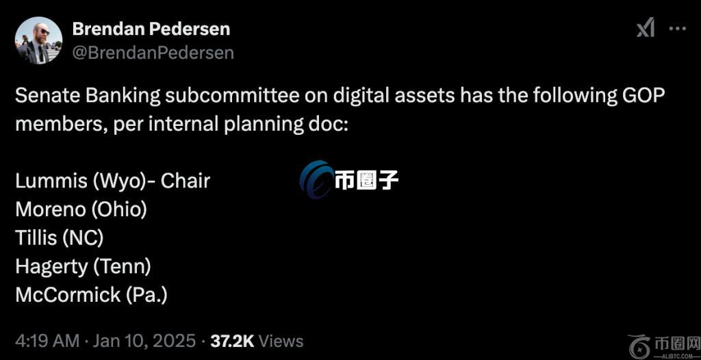 《大酒杯新闻(Punchbowl News)》的金融服务记者Brendan Pedersen对此也在社群媒体X上透露,预计将由支持加密货币的参议员Cynthia Lummis,领导这个新成立的数字资产小组委员会:根据参议院助理的说法,部分共和党成员已「初步选定」了该小组的领导者及成员,但这些人选仍需等待委员会投票后才能正式确认。