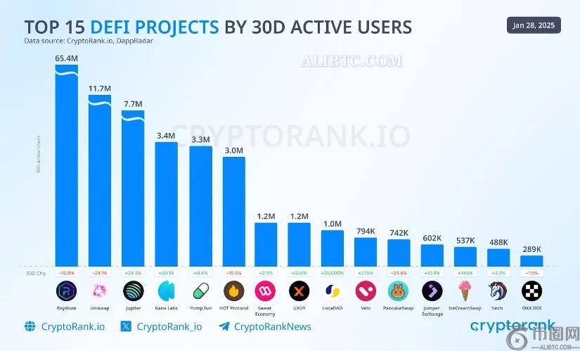 除此之外,Solana 的 TVL持续攀升,在截至 1 月 28 日的 30 天内上涨了 27%。这意味着该链仅通过代币投机就获得了一些严重的吸引力,去中心化金融协议正迅速成为 Solana 生态系统的核心部分。