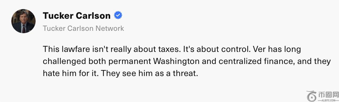 著名的美国保守派评论员及电视主持人塔克·卡尔森公开表态支持Ver,并催促特朗普给予他赦免。