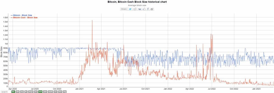 但实际上,自2017 年以来,BCH 的平均区块大小只有数次是超过1 MB。我们可在BitInfoCharts.com 上比较BTC 和BCH 的平均区块大小。