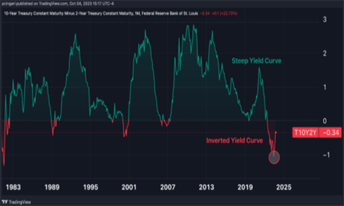 目前1个月期和3个月期美国国债收益率接近5.5%,而2年期国债收益率接近4.96%。10 年期国债收益率为 4.65%,这意味着 2s/10s 曲线反转了 31 个基点。