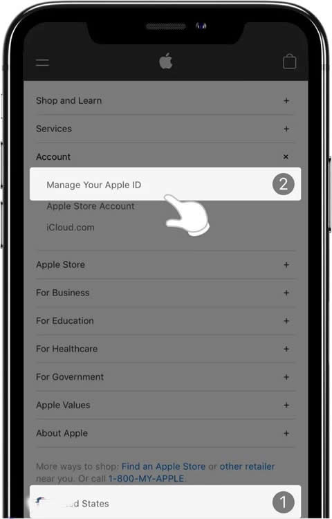 2、将页面拉到最底部,切换国家到United States>>点击Account>>Manage Your Apple ID>>在新页面底部点击Create Your Apple ID