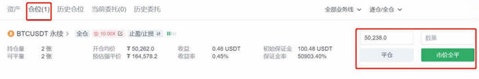 5. 开仓后的委托单可以在【仓位】栏下查看,当收益达到预期时,可以进行平仓操作。