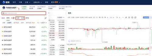 3. 点击币对栏,在下拉页面币种搜索栏里,输入您想要交易的币种、币对,再选择合约类型。