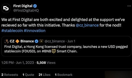 FDUSD的发布也“巧合的”和香港新的虚拟资产服务商发牌制度一起于6月1日推出。在今年6月1日,币安创始人CZ就发布了First Digital将在BNB智能链上发行稳定币的消息。因此,FDUSD背后可能有浓厚的“香港”标签,也可能有币安的支持,甚至此前也有FDUSD可能上线主要交易所的消息传出。